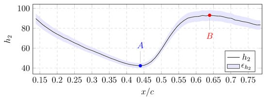 In Figure 9 the heat transfer coefficient is shown along mid-span for the flow coefficient . The shaded area shows the confidence interval of two standard variations, calculated using Equation (3) with experimental data sampled during one camera view and uncertainties as stated in earlier sections. The confidence interval varies between 4% and 6% along mid-span as the contribution from different independent variable changes. For the whole full span data the calculated total uncertainty of the heat transfer coefficient spans 2.5% to 8%. Two points are selected for detailed scrutiny and are marked in Figure 9. The first, marked as A, is located at the minimum convective heat transfer at . The second, marked as B, is located at where the highest convective heat transfer occurs for that camera’s field of view (FOV).