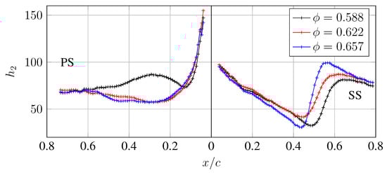 The steep increase in heat transfer is likely to be due to a laminar-turbulent transition. This is a commonly used rationale as skin friction is an order of magnitude higher in the turbulent boundary layer and hence by using the Reynolds analogy the heat transfer increases as well. The same rationale is adopted in the differential infrared thermography (DIT) measurement as used by Gardner in [16] and by Filius in [17]. Following this rationale, Figure 11 shows a transition location moving upstream on the suction side with increased . Note that an increased LPT flow coefficient causes an increased inlet angle to the TRS and higher OGV blade loading. The two cases and show very similar trends. At the change in heat transfer is larger in magnitude and shorter in length, indicating a different mode of transition. It is likely to be a bypass transition for = 0.588–0.622 while a possible separation induced transition is occurring at , the data in this work are however insufficient to state the exact nature of the transition. The steep increase of the HTC on the pressure side for the case may be due to a separation induced laminar-turbulent transition as it only occurs at low inlet flow angles.