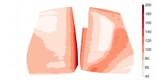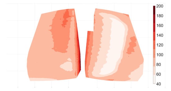 To accommodate for in lateral wall conductive heat flux a three-dimensional conjugate heat transfer was numerically simulated using FEM in both ANSYS™ and MATLAB™. The simulations were performed on a digital version of the test geometry’s shell by using elements and normalised experimental data for core and surface temperature, later discussed in Section 6. Some areas of the geometry’s surface could not be acquired by the camera due to geometrical limitations. Hence, to obtain a complete vane surface temperature for the FEM simulations, the nearest neighbour extrapolation was used. A conservative cut-off criterion has been applied to only use data where the wall thickness is uniform and far from the vicinity from the extrapolation. Because of this, data near the hub and shroud fillets and portions of the trailing edge have been removed. At areas with the highest surface temperature gradient, the effect from in-wall heat transfer when compared to the one-dimensional calculations is . The uncertainties from the FEM calculation can be expected to be much smaller than this.