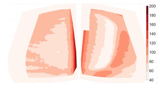 Figure 12, Figure 13 and Figure 14 show the contours of surface heat transfer on the pressure and suction sides of the OGV at the different load cases. The data have been selected to comply to above-stated uncertainties, leading-edge data have been limited due to camera view angles over , trailing edge, near hub and shroud data have been limited to keep uncertainties from FEM simulations to a minimum. The outline of the full vane is illustrated in Figure 13. From heat transfer contours on the suctions side features such as roll-up vortex and transitions distribution can be deduced. The low heat transfer from the expanding roll-up vortex increases in effect spanwise with increased . This has earlier been observed in [10] ( Figure 7). Local points of high can be seen near the hub for ; this area is a heavily loaded point with very high acceleration as earlier shown by pressure distribution in [2], (Figure 4.15) and is an area of much interest for future studies.