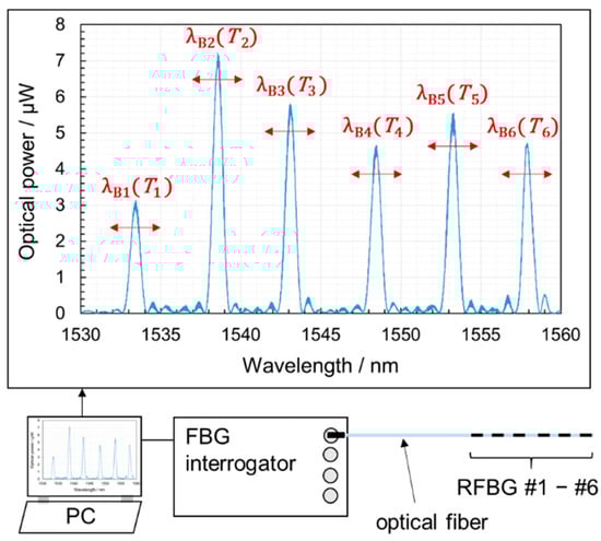 As mentioned in Section 1, the gas turbine was instrumented with a fiber-optic temperature-sensing system based on wavelength-multiplexed RFBGs. The functional principle is shown in Figure 2. Six RFBGs were consecutively inscribed in a standard single-mode fiber SMF28 (Corning, Corning, NY, USA) with individual spacings of about 20 mm. An FBG interrogator SM125 (Micron Optics, Atlanta, GA USA) measured the spectral data. Each RFBG caused a specific peak in the spectrum, and the spectral separation of the peaks was about 5 nm (Figure 2). The individual positions of the peak wavelengths depend on the temperatures of the respective fiber segments. Using a wavelength–temperature calibration function [10,11,14], the local temperatures can be calculated from the corresponding wavelength shifts. It has been shown that RFBG sensor elements, which were fabricated in the same type of optical fiber and which were produced with the same parameters, share the same calibration function [14]. By applying this calibration procedure, a temperature uncertainty of 4.5 K has been estimated in a temperature range up to 500 °C [11]. In previous investigations with three-point RFBG temperature sensors in a gas turbine of the same kind, RFBG-based temperature data were compared with thermocouple data, and the comparison showed deviations of less than 3 K [10], which was in good accordance with the estimated temperature uncertainty. It is worth mentioning, here, that the maximum number of RFBGs is not generally limited to six; several tens of temperature measurement points are possible.