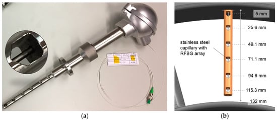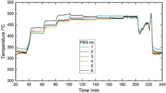 In some of the industrial applications that would benefit from using multipoint FBG sensors, temperatures exceed 400 °C. Here, common type I FBGs are not suitable because they strongly degrade at elevated temperatures. Instead, FBG types capable of resisting high temperatures, such as femtosecond laser-inscribed FBGs [1,2], chemical composition gratings [3,4], and regenerated gratings [5,6], come into operation. Packaging techniques, calibration procedures and temperature drifts strongly influence the functionality and performance of FBG sensors. For the measurements presented here, we used regenerated FBGs (RFBGs), which emerge from type I FBGs in H2-loaded fibers when subjected to a special annealing process. RFBGs can be used at temperatures up to 1200 °C [7]. Applications of multipoint sensing based on high-temperature FBGs have been reported for combustor systems [8], nuclear reactors [9], chemical reactors [10,11], and gas turbines [10,12,13].