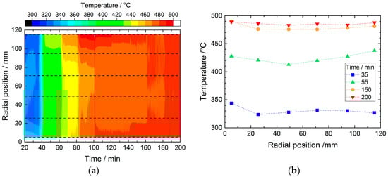 (a) Contour plot of the temporal progress of the temperatures in the exhaust-gas diffusor; (b) Radial temperature distributions extracted from the contour diagram.