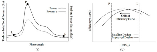 Schematic representations: (a) The pulsating pressure at the turbine inlet and the turbine power output in an engine cycle; (b) a shift of efficiency curve towards low U/C side.
