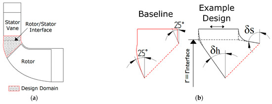All the CFD simulations in this study had the same domains, interface, and modeling setting as the baseline in Figure 3b. However, the geometry of the stator endwall was redesigned with different tilting angles. The design domain of the stator tilting endwall was limited to the vaneless space between the stator vane outlet and the rotor blade inlet, as shown in Figure 5a. Since there were no geometric modifications in the other domains, such as the pre-swirl vane, the back-disk cavity, and the exhaust diffuser, for simplification reason, only the stator and rotor domains are shown here to illustrate the stator tilting endwall designs. The rotor/stator interface was kept at the same radius for all the designs, namely rinterface. On the stator side, any design modifications were intentionally kept out of the stator vane domain. As a result, the geometry of the stator vane was exactly the same as the baseline. This simplified the design process by avoiding the re-design of the stator vane and a direct comparison between different designs was enabled based on the same upstream layouts. On the rotor side, a conical plane upstream the rotor leading edge was selected as the design domain boundary (red dashed line in Figure 5a). This constrain led to an unchanged mesh in the downstream rotor domain and an unchanged rotor tip clearance. It should be highlighted that the meshes at the design domain outlet were fully matched with the downstream rotor domain for all designs.