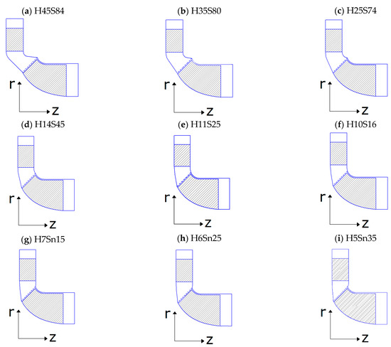 Following the aforementioned design processes, the design matrix is presented in Figure 6. The designs were named as “HxxSyy” meaning δh was “xx” degrees and δs was “yy” degrees. If the angle was negative, then a lowercase letter “n” was added before the angle number (e.g., H5Sn35). Both δs and δh decreased from the upper-left corner to the lower-right corner of the matrix. The boundary of the design matrix was mainly limited by the mesh quality. As a result, the variation range of δh was between 45° and 5° and δs varied between 84° and −35°. The wider range of δs was due to the shorter endwall profile on the shroud side leading to a more drastic change of the tilting angle as the design domain inlet moved in the axial direction. Although the design matrix might have been further extended by using a different meshing topology, it would have caused problems to compare the results with different mesh topologies. Therefore, the current extent of the design matrix was accepted for this study.