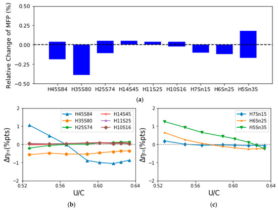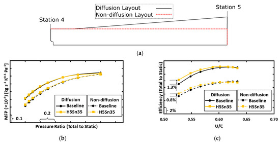 In Figure 18b, the MFP curves of the H5Sn35 and baseline stator designs with the “Non-diffusion” layout closely overlapped with each other, which indicated that there was no significant shift of the mass flow. Therefore, the performance of different stator designs was still comparable without the exhaust diffuser. But in general, the “Diffusion” layout had a higher MFP than the “Non-diffusion” layout on the whole performance curve due to the diffusion effect of the exhaust diffuser. This effect caused a higher pressure ratio between the rotor inlet and outlet and thus a higher MFP for the “Diffusion” layout compared with the “Non-diffusion” counterpart.
