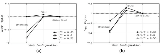 Design H5Sn35 had a promising efficiency gain at the low U/C end of the performance curve. However, due to the significant change of endwall geometry, a mesh independence study was needed. Three mesh configurations were investigated, as shown in Table 1. The standard configuration had the grid density that was used to generate all CFD results throughout this paper. The other two configurations were refined configurations, and the element number was normalized by the standard one. The mesh independence study was conducted on three operating conditions with different U/C values, i.e., the end points of the performance curve and the peak efficiency point of design H5Sn35. A direct view of these operating conditions can be seen in the following contents. It can be seen from Figure 8 that the maximum deviation between the standard and the extra fine configurations is −0.8% for MFP and −0.2% pts for efficiency. Despite the MFP deviation, all three mesh configurations of the H5Sn35 design predicted similar MFP values to the baseline. The difference of MFP fell within the range of −0.7% to +0.6% [23], indicating the two designs were comparable. The negative deviation of efficiency meant the extra fine mesh predicted an even higher efficiency improvement at the low U/C end operating condition. Although the extra fine mesh may predict a more accurate result, its application in the current study was limited by the heavy computational effort it needed. This was especially a key issue when predicting the performance curves and conducting unsteady simulations. Therefore, as a trade-off, the standard configuration was still chosen in the following contents.