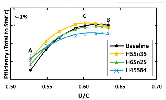 Since design H5Sn35 achieved the best performance out of the design matrix, a detailed analysis of its flow field was needed to understand the reason for its performance improvement. In addition, since the improvement trend was already evident in design H6Sn25, it was considered useful to compare H5Sn35 with H6Sn25 to understand their differences. The other interesting design was H45S84 which showed a similar level of improvement at the low U/C end as H5Sn35 but a rather low efficiency at the high U/C end. A detailed analysis of its flow field could enhance the understanding of the similarities and differences between H5Sn35 and H45S84. Therefore, three designs, namely H5Sn35, H6Sn25, and H45S84, were selected for detailed flow-field analysis. The efficiency curves of these three designs and the baseline are shown in Figure 9. Compared to the baseline, the peak efficiency point of design H5Sn35 had a distinct shift to the low U/C side, i.e., from 0.62 to 0.60 and the peak efficiency increased by 0.2% pts. Based on the efficiency curve of H5Sn35, three working points were selected for the flow field analysis: the extreme ends of the curve, point A (U/C = 0.53) and B (U/C = 0.63); and the peak efficiency point, point C (U/C = 0.60).