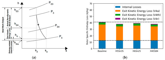 Figure 10 illustrates the loss breakdown in the rotor for the baseline and the selected designs. In the enthalpy-entropy diagram (Figure 10a), the expansion process in the rotor was represented by the arrowed curve. Four specific enthalpy values (namely h03, h04, h4, h4is) were marked in this diagram which could be used for the loss breakdown. As shown in Figure 10a, the ideal work output could be calculated as an enthalpy difference. Furthermore, this enthalpy difference could be divided into three sections: the actual aerodynamic work output; the exit kinetic energy loss; and the entropy-related internal losses. It should be noted here that exit kinetic energy loss could have a further breakdown by the rotor outlet velocity components: