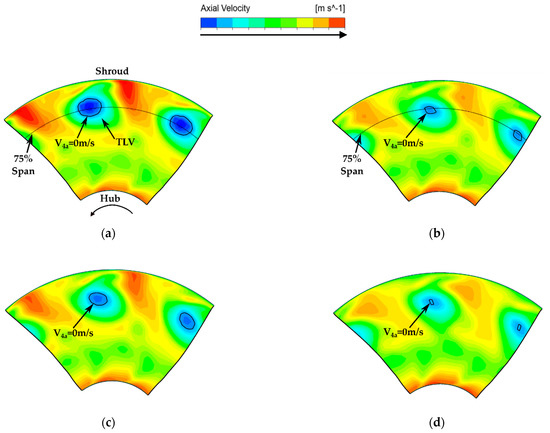Axial velocity contour on the surface of station 4 at operating point A (Figure 9). (a) Baseline; (b) H5Sn35; (c) H6Sn25; (d) H45S84.