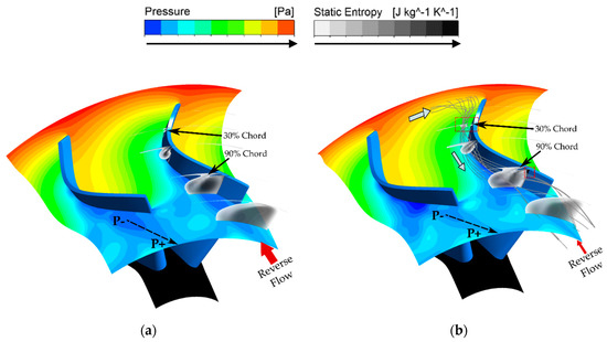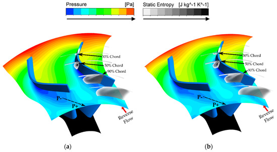 Pressure distribution on 75% span surface and high entropy regions on streamwise sections at operating point B (Figure 9). (a) Baseline; (b) H5Sn35.