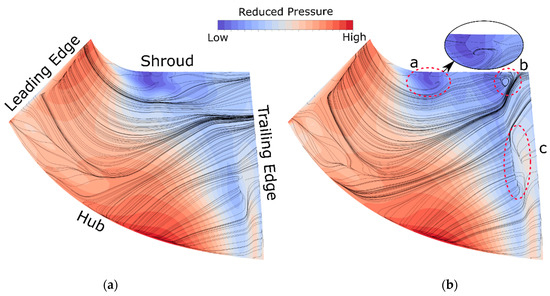 Skin friction lines and reduced pressure contour on rotor blade suction surface at operating point A (Figure 9). (a) Baseline; (b) H5Sn35.
