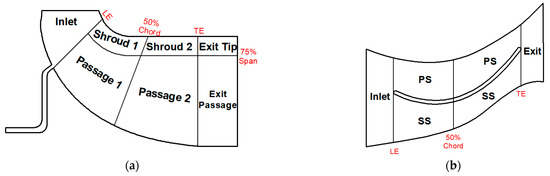 Schematic views of rotor sub-domains for internal loss analysis. (a) Meridional; (b) blade-to-blade.