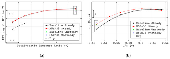 The time-averaged unsteady CFD results were plotted together with the steady-state CFD results and the Exp data in Figure 19. The operating point A is marked in a rectangular symbol. In Figure 19a, the MFP predicted by the unsteady CFD simulations were about 1% lower than the steady state results for both designs. But considering the deviation of MFP between the steady state CFD results and the Exp data, the lower MFP predicted by the unsteady simulations may lead to an improved matching with the Exp data. In Figure 19b, the efficiency gain still exists for the unsteady CFD results. However, the improvement reduced from 1.3% pts to 0.5% pts. A detailed analysis of the unsteady CFD simulations is needed in the future to explain the change. Full-360 CFD simulations or Exp data of H3Sn45 may be needed to provide further validation.