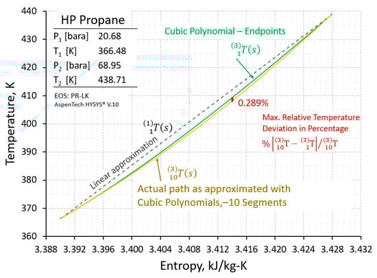 The relationship (41) shows the actual temperature-entropy path, as approximated with a set of “” cubic polynomial approximants, , and the temperature deviation at each segment,