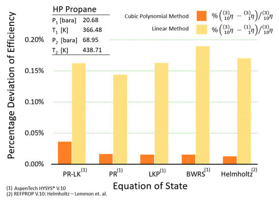 Figure 6 compares the efficiency deviation of the linear endpoint and cubic polynomial endpoint methods from the highly accurate 10-segment cubic polytropic efficiency, using different equations of state for the high pressure propane case with the conditions shown on the figure. Evidently, the linear endpoint method involves significantly larger deviations for the polytropic efficiency as compared with the cubic polynomial endpoint method.