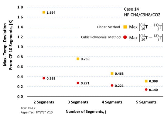 As shown in Figure 7, maximum temperature deviation along the polytropic path reduces as the number of steps increases. As expected, linear approximation involves larger deviation as compared with cubic polynomial approximation for the same number of steps or segments. As reviewed in Appendix C, a maximum of five cubic polynomial segments has been documented to provide sufficient accuracy for a broad range of example cases by Evans [3].