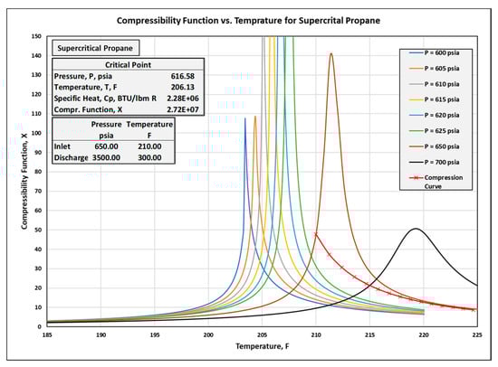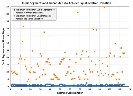 Because the linear method ignores the change in slope and concavity along the compression path, a large number of steps are needed to achieve the desired accuracy. Sandberg [23] provided no criteria to determine the required number of linear steps to approximate . The uncertainty about the required number of steps in the linear multi-step method could possibly be overcome by applying a large number of linear steps (50 to 100+ steps) to ensure sufficient accuracy. However, pre-selecting 50 or 100+ linear polynomial steps has been shown to be inefficient, (see Figure 11). Utilizing a large number of linear steps significantly increases the calculation time due to the required nested iteration loops. Figure A3b documents a comparison of elapsed time measurements for the supercritical propane example case.