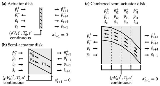 Blade row models for determining acoustic impedance: (a) actuator disk, after Cumpsty and Marble []; (b) semi-actuator disk, after Kaji and Okazaki []; (c) our cambered semi-actuator disk.