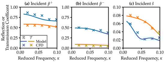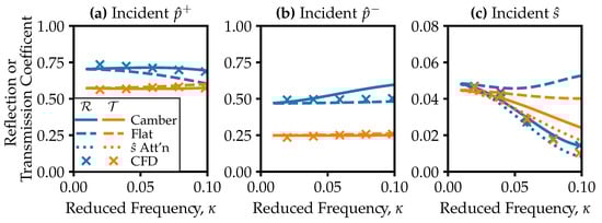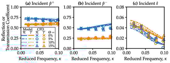 Figure 4 displays predicted acoustic impedances for an uncooled turbine vane, in terms of magnitudes of the (complex) reflection and transmission coefficients,  and , as a function of reduced frequency, . Results for incident downstream-running pressure, upstream-running pressure, and entropy waves are shown in Figure 4a–c. We define the entropy wave coefficients as the entropy–acoustic transfer functions, suitably normalised: for example  and .
