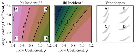 For incident pressure waves, Figure 7a, the reflection coefficient is three times more sensitive to flow coefficient than stage loading coefficient. Increased aerofoil stagger angle produces greater acoustic impedance by geometric blockage [], which leads to the highest reflection coefficient for high-turning designs. The blade speed Mach number  scales rotational effects on the acoustic impedance; it reduces as stage loading increases, offsetting some of the rise in reflection coefficient due to increased turning. For incident entropy waves, Figure 7b, change in axial Mach number drives the trend in reflection coefficient. For constant vane exit Mach number, the axial Mach number and, hence, entropy–acoustic reflection is greatest for low-turning designs.