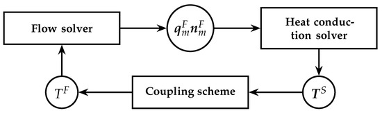 where are heat fluxes and is the thermal conductivity of the solid. The flow and heat conduction solvers communicate across the fluid–solid interface (FSI), where and must be satisfied. , are the normal vectors to the FSI pointing toward and , respectively.