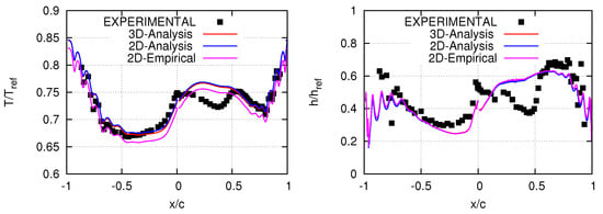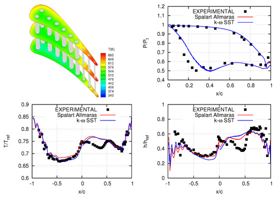 An unstructured 3D grid with M nodes was generated with M for the hot gas, K for the coolant flow, and K for the solid domain. The grid has structured layers close to the pressure and suction sides and the cooling channels to account for the large spatial gradients of and in these regions. The rest of the fluid and solid domain is filled with prismatic elements. Both the Spalart–Allmaras and SST turbulence models were used in the analysis phase. The fields computed at the hub, shroud, and midspan of the solid blade are presented in Figure 2 (top left), illustrating the effect of the cooling fluid flow at the blade temperature. Pressure, temperature, and heat transfer coefficient distributions along the blade midspan are compared with measurements in the same figure. A good agreement is observed for both models, though the temperature along the suction side and close to the leading edge is overestimated due to the absence of a transition model.