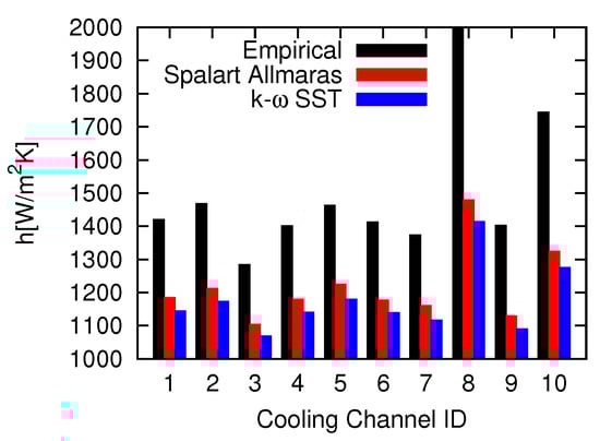 Comparison of the heat transfer coefficients of the cooling channels computed by the two approaches.