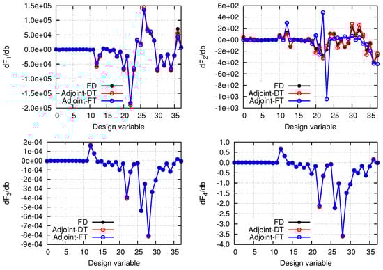Verification of the sensitivity derivatives computed by the adjoint method with the differentiated turbulence (DT) model and with the frozen turbulence (FT) assumption for (top left), (top right), (bottom left), and (bottom right). Finite differences are used as the reference values.