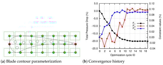 The CHT optimization of the C3X turbine blade follows: The target was to minimize both the total pressure drop and the highest temperature of the blade while the inlet capacity and the hot gas exit flow angle were constrained to change up to % from their datum values. A first shape optimization was performed targeted at minimizing the total pressure drop under the above flow constraints. The 7 × 3 volumetric NURBS control grid of Figure 6a was used to control the blade shape. As in the verification study of the previous section, the control points at the leading and trailing edges remained constant, while the rest were free to move in the axial and pitch-wise directions. In this optimization run, in order to avoid the intersection of the cooling channels with the blade sides, the locations of their centers were controlled by the same control grid, while their radii were constant. In total, 38 design variables were used. To adapt the fluid domain grid to the changing boundaries, the spring analogy technique [16] was employed. The grid inside the blade was generated from scratch based on the new blade shape and cooling channel locations. Figure 6b shows the design variable bounds (used as extra geometric constraints). The method of moving asymptotes [17] was used, and its convergence is plotted in Figure 6b. The total pressure drop has decreased by ∼21% after 20 cycles by satisfying the flow constraints.