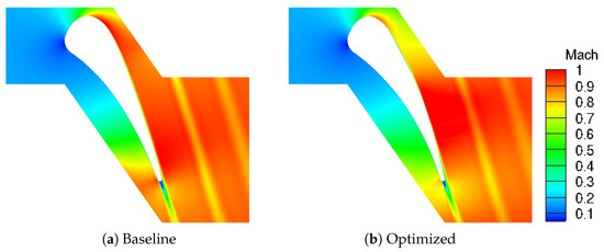 Figure 8 presents the Mach number fields computed for the baseline and the optimized configuration (i.e., the outcome of the second optimization run). It is clear that the reduction in total pressure drop is mostly achieved by reducing the flow velocity in the passage throat region.