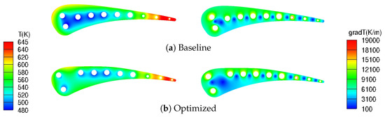 Computed temperature (left) and temperature gradient magnitude (right) fields for the baseline and the optimized configurations.