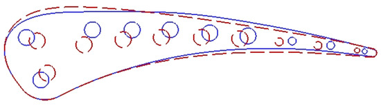 Baseline (red) and optimized (blue) blade’s shape and cooling system.