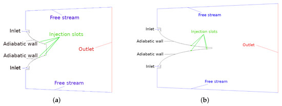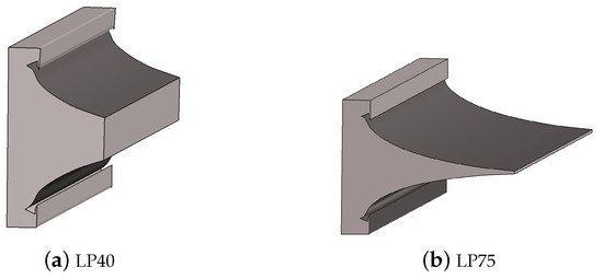 Figure 2. The flow field in these nozzles is bidimensional for most the extension; the three-dimensional effects are confined to the extremities. For this reason, bidimensional simulations were performed in this work. The computational domain and the enforced boundary conditions for both the LP40 and LP75 geometries are reported in