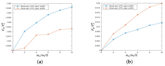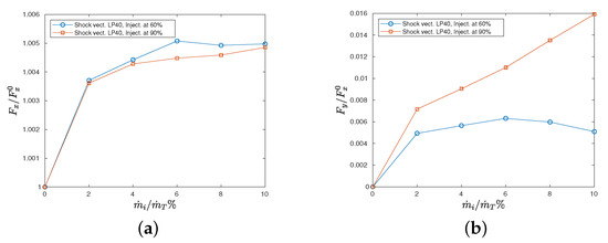 Figure 7a shows the axial thrust component: its value is slightly increased when the secondary injection is introduced. This is due to the fact that the secondary injection has a small axial component and this leads to a weak increase in the axial thrust component.