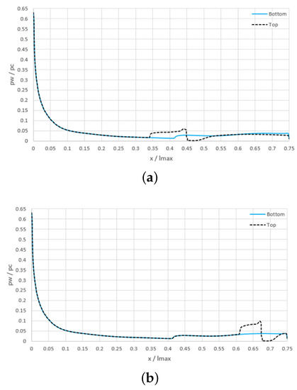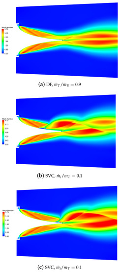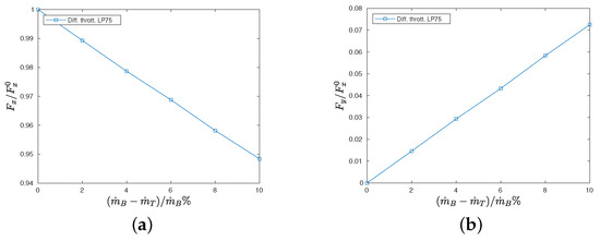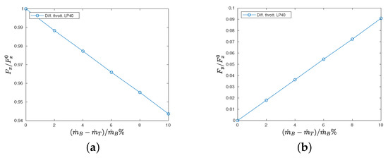 Figure 5a, the results obtained by differential throttling are reported: this solution is obtained by reducing the total pressure in the top chamber while keeping the same total temperature in both chambers. As a result, the mass flow rate from the top chamber is reduced, while the mass flow rate from the bottom chamber remains constant. In particular, the plot refers to the condition