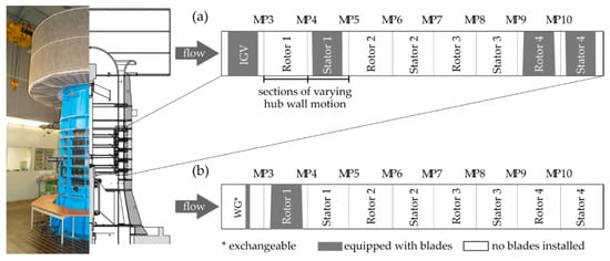 Low Speed Research Compressor (LSRC)—cross section of investigated setups with stator S1 (a) and rotor R1 (b).