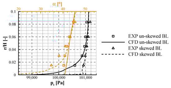 The influence of a skewed inlet BL is investigated by comparing the shrouded stator cases with the rotating R1 disk, inducing a skewed BL, and the cases with the stationary band, suppressing the skewness and thereby producing an un-skewed BL. The difference in inflow can be seen in Figure 2, where the pitchwise averaged radial distributions of total pressure pt (in black) and flow angle in absolute frame of reference α (in orange) are shown for MP4. Here lines, solid for un-skewed and dashed for skewed BL, represent results from computational fluid dynamics (CFD) calculations and the symbols, square for un-skewed and delta for skewed BL, denote to the experimental data (EXP).