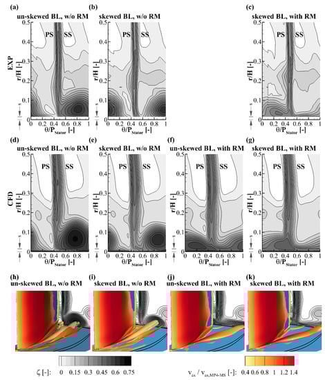 Here the pitchwise averaged total and dynamic pressure in the upstream plane (MP4) at midspan (MS),  and , are used as reference. For the nominal clearance case of s/C = 2.0% the ζ contours in MP5 are shown for skewed and un-skewed inflow BL without relative motion (RM) of the hub endwall in Figure 3a,b. A deviation in position of the TLV, represented by the circular areas of high ζ, is apparent with an approximated shift of the core of 0.15 θ/PStator in pitchwise direction, where θ/PStator corresponds to the circumferential distance normalized by S1 pitch. In a compressor cascade a skewed inlet BL reduces the cross passage flow in the vicinity of the hub as its direction of influence directly opposes the pressure gradient from pressure side (PS) to suction side (SS) of two adjacent vanes. This weakens the passage vortex and was observed for a linear compressor cascade by Moore and Richardson []. In the current work these findings were confirmed for the axial machine in a non-clearance case for S1, cf. Koppe et al. [].