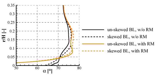 Looking at the pitchwise averaged distributions of flow angle α, Figure 4, an increase in values between 5 and 25% of relative channel heights is visible for the un-skewed BL case with RM compared to the case without, as was seen for the skewed BL configuration, cf. Section 2.4.1. Here, the distributions follow a similar trend down to around 11% r/H where a sudden further increase in flow angle is detected for the setup with relative motion. Comparing to the 2D plot of non-dimensional total pressure loss, this relative channel height corresponds to the upper bound of regions with higher losses associated with the TLV, see Figure 3f. With the relative endwall motion reducing the spanwise and increasing the pitchwise expansion of the TLV, the overall influence of the vortex on the pitchwise averaged flow angle at these radial positions will increase. As the orientation of rotation of the TLV favors higher flow angles in the upper part of the vortex, the sudden increase in values is reasonable. Below the vortex core this trend will reverse adding to the extensive influence of the moving endwall resulting in the clear drift towards smaller flow angle values for the case with RM in the vicinity of the hub (r/H = 0), see Figure 4.