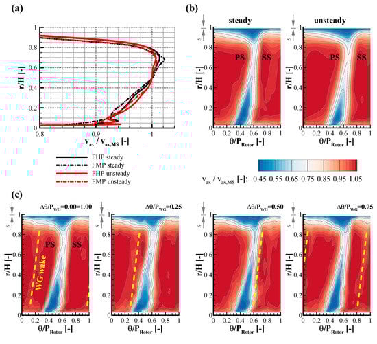 A closer look at the unsteady case is given in Figure 5c where four distinct relative positions between WG and R1 are shown. Here, a fluctuation of the TLV can be observed by the change in the region of low non-dimensional axial velocity throughout the four time steps. At each time step the remains of incoming bar wakes are marked with yellow dashed lines and can be identified by areas of reduced relative axial velocity. They progress from left to right with each time step. From relative position one (Δθ/PWG = 0.00) to two (Δθ/PWG = 0.25) a reduction in low non-dimensional axial velocity is observed in the tip region where the deterioration progresses as the bar wake approaches the rotor. After passing the rotor wake, the area of low relative axial velocity in the vicinity of the blade tip strengthens again and increases with growing distance of the WG wake, as can be seen in time steps three (Δθ/PWG = 0.50) and four (Δθ/PWG = 0.75).