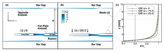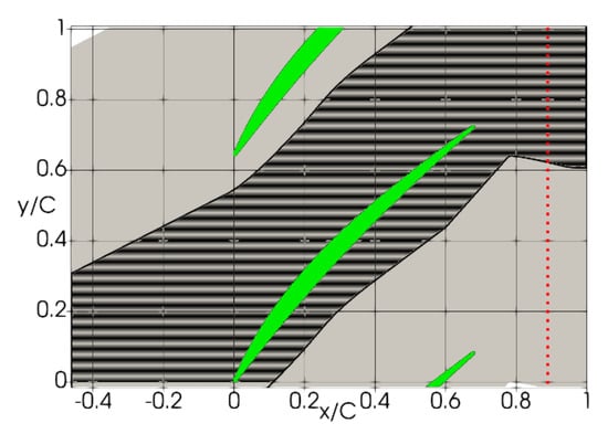 The studied geometry was defined according to the linear cascade setup of the Chair of Turbomachinery and Flight Propulsion at TU Dresden conducting sub-project A []. The blade profile represents a scaled tip section of the reference built rotor of the LSRC [,] described in Section 2.2.1. In the current investigations the linear cascade has a chord length of , an aspect ratio of , and is mounted with a stagger angle of 46.9°. The leading and trailing edge profile angles are  and , respectively. The cascade has a solidity of . Furthermore, the present case features a tip gap of width ) between the endwall and the blade tip. The endwall is located at the bottom of the computational domain, where . A sketch of the blade profile is depicted in Figure 6.
