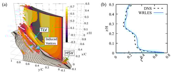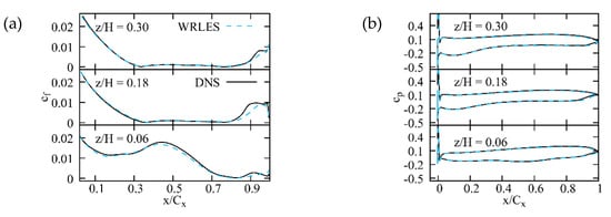 at different spanwise locations, shown in Figure 8a, revealing overall very good agreement, except for , where the WRLES predicts lower  values and a later but somewhat stronger increase. Similar findings were observed in simulations of a turbine stage by Michelassi et al. []. These differences lead to differences in the wake, which beside the modelling uncertainty, result in the deviations presented. Nonetheless, apart from the trailing edge region the DNS data are well reproduced, with a 6-fold reduction in computational resources.