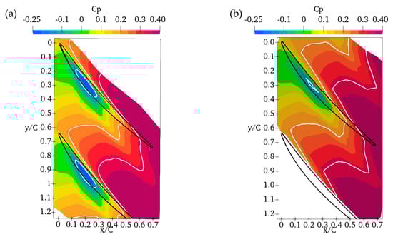 Further validation is now performed with experimental data for , matching the configuration of Krug et al. []. Figure 9 presents a comparison of the pressure coefficient at the endwall. Overall good agreement is found, with pressure isolines showing similar distributions. A pressure minimum at the tip gap somewhat larger in size is obtained in the present numerical simulations, but measuring at such a position is not free of error. Beyond the position of this pressure minimum, the TLV departs from the blade , still remaining relatively close to the blade. Between the blades, pressure isolines exhibit a mirrored S-shape. The reason for this is the TLV, as stated in [,,]. This was confirmed by looking at the pressure in planes perpendicular to the blades’ camberline. It exhibits a minimum at these positions matching the location of the TLV.