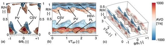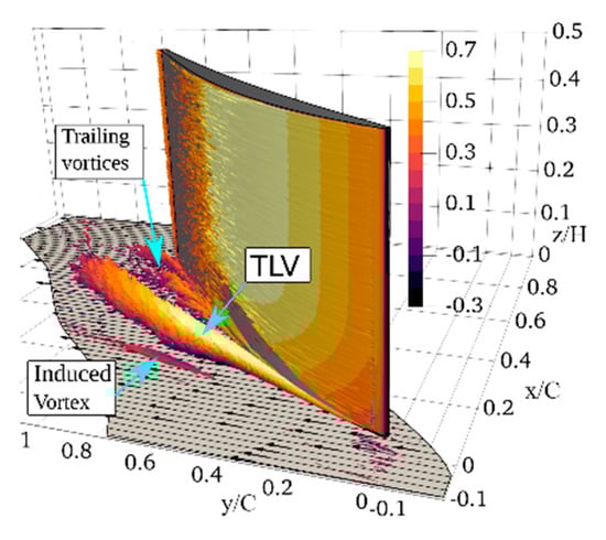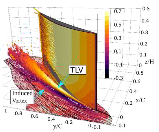 The overall vortical structure of the flow in this configuration is visualized through isocontours of  in Figure 11. The dip in the pressure isolines within the passage shown in Figure 9 matches with the trajectory of the TLV identified through . The induced vortex, that is visible by the -isosurface, is not detectable through the pressure at the endwall due to its smaller magnitude.