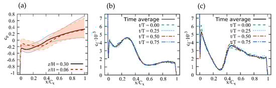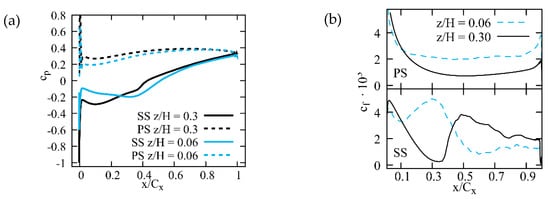 Focusing on the blade, the aerodynamic load is mostly towards the front, Figure 12a, with an almost vanishing pressure gradient at the PS and a mild negative pressure at the SS, exhibiting a minimum towards the front. The effect of the secondary flow is to reduce the blade loading, as evidenced by the differences between the pressure coefficient on PS and SS near the blade tip () compared to the midspan region (), as seen in Figure 12a. Furthermore, the local minimum at the SS for  is shifted downstream. Its position is slightly downstream of the position where the TLV departs from the blade. Furthermore, the minimum in the pressure at the SS at each spanwise height coincides in position with the start of the decrease of the friction levels shown in Figure 12b. For instance, at the midspan the pressure minimum is at  and the local friction maximum at .
