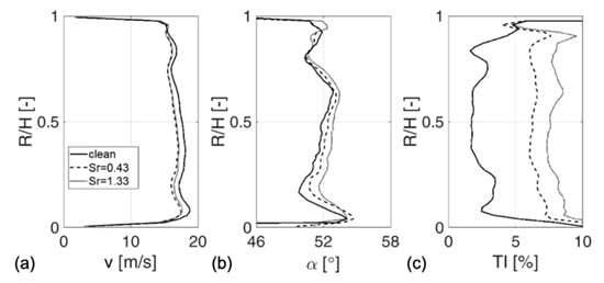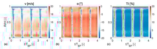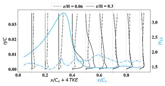 Figure 13 shows the state of the boundary layer along the SS by means of the shape factor  and by wall-normal profiles of the TKE. At the tip () the shape factor is small all along the wall. Hence, the boundary layer at this height is turbulent throughout the whole blade chord. Furthermore, no marked change in shape factor related to the departure of the TLV at  is observed. The friction coefficient near the tip, shown in Figure 12b, on the other hand, exhibits a marked change. Once the TLV moves away from the blade the friction coefficient decreases by a factor of more than two. Away from the blade wall an increase in TKE is observed for , which is directly related to the location of the TLV. Downstream of the blade, at , these higher fluctuations are also observed around the TLV core, as seen in Figure 14.