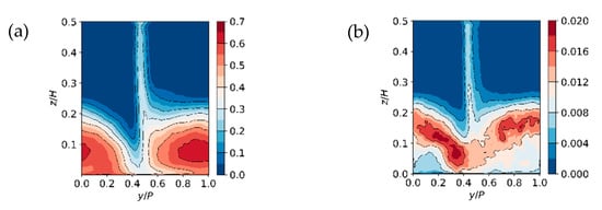 Regarding boundary conditions, an unsteady turbulent flow was imposed at the domain inlet and a convective condition was set at the outlet. The turbulent inflow conditions were generated through a precursor simulation, enforcing mean and fluctuation profiles from experiments [], with a boundary layer thickness at the inlet of  and a turbulence intensity  at midspan []. At the endwall, no-slip conditions were imposed, while at the midplane symmetry conditions were applied. The domain size in spanwise direction is large enough so that the midplane boundary conditions do not influence the secondary flow.