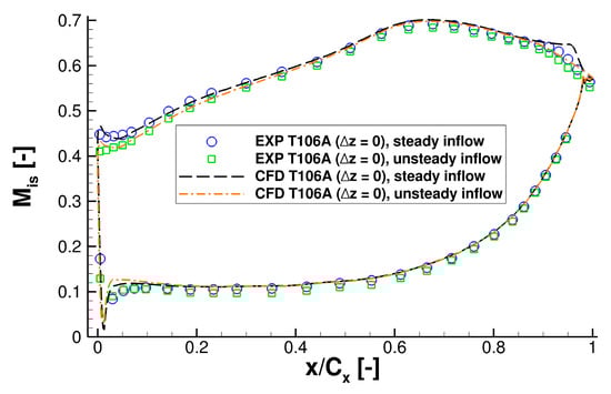 In the following mainly results of Wall-Resolving Large Eddy Simulations (WRLES) at  are presented. This set-up matches the configuration of Krug et al. []. Inlet velocity  and blade chord  were used to define the Reynolds number. For the LES, the WALE model [] was used to model the subgrid scales. Additionally, results obtained through DNS and WRLES at  are first discussed for validation of the method. The lower Reynolds number was chosen to obtain sound reference data by simulating the configuration described using DNS with reasonable computational resources.